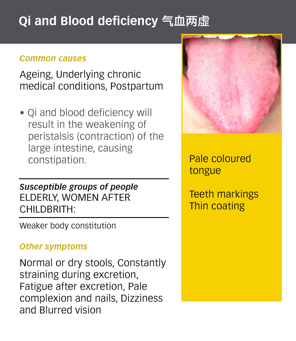 From a TCM point of view, constipation is the result from the weakened large intestine function to transmit waste products. There are 3 main syndromes of constipation and they are: Spleen deficiency 脾虚食滞, Dampness heat 肠胃湿热 and Qi and Blood deficiency 气血两虚.