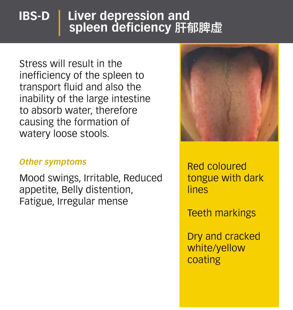 IBS is classified into 2 main subtypes, including IBS with diarrhea (IBS-D) and IBS with constipation (IBS-C). According to TCM Zang Fu theory, IBS-D correlates to the Liver depression and spleen deficiency syndrome (肝郁脾虚) while IBS-C is due to Dryness and heat in intestine syndrome (热结肠燥).