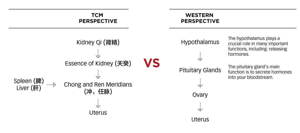 The Ren meridian regulates the uterus and the Chong meridian is said to act as a blood reservoir for the uterus. The abundance of congenital kidney essence and balance of spleen and liver functions ensure the surplus of Qi and blood flowing along the uterus for a menstrual cycle to occur.
