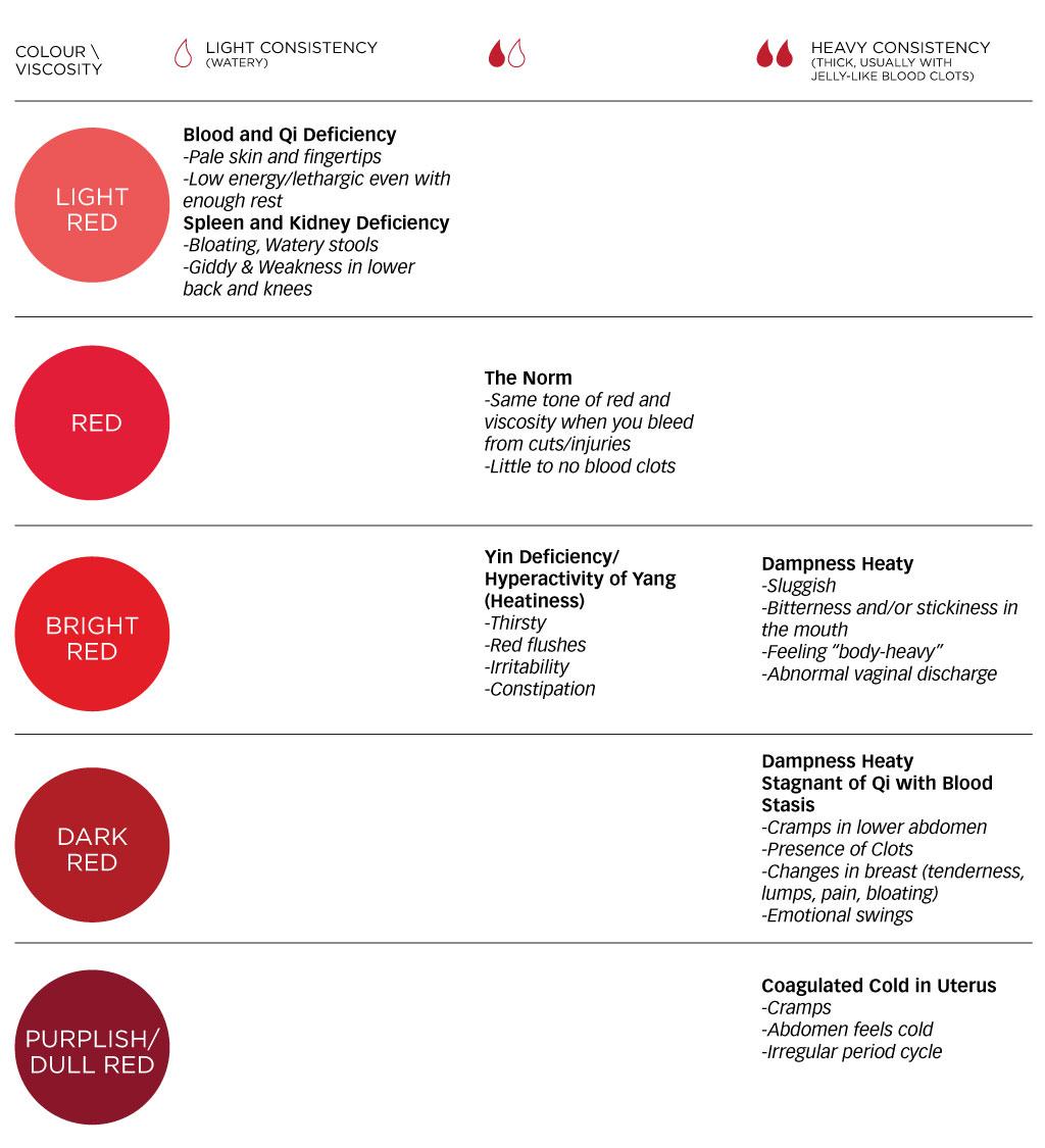 • Period colour and viscosity are distinctive symptoms in TCM context explained based on your body constitution and the balancing of Yin and Yang in general. Together with their accompanying symptoms, which one do you match with?