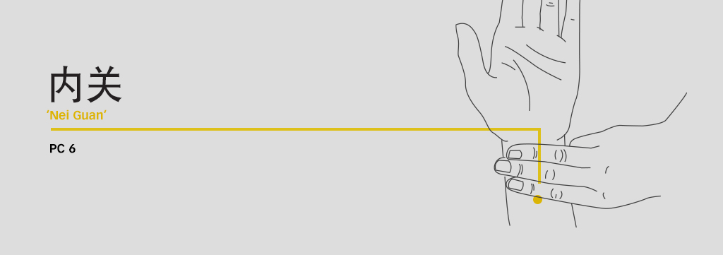 Location: Place 3 fingers (index, middle and ring finger) below the wrist crease line, acupoint can be found in between the tendons of the long palmar muscle and radial flexor muscle of the wrist.