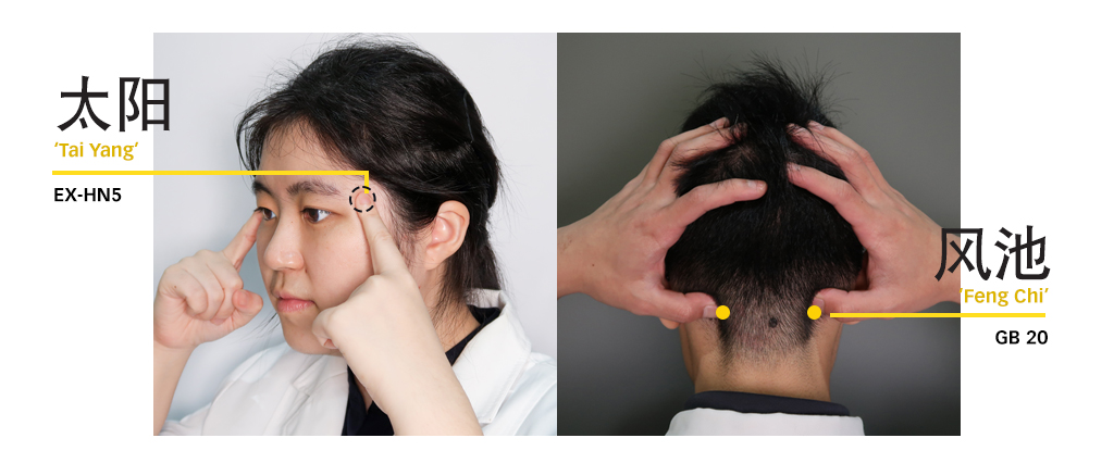 Location: at the temples. Take the midpoint between the end of the eyebrow and the outer corner of the eye, and move a middle-finger spacing backwards where you can feel a depression.