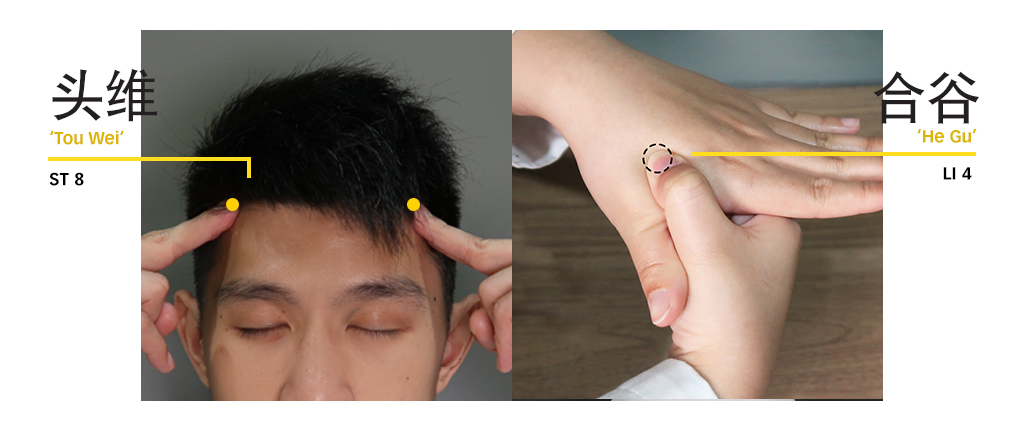 How to massage: Locate the acupoints shown below and apply gentle pressure using your fingertips. Massage for 3-5 minutes or until you feel better.