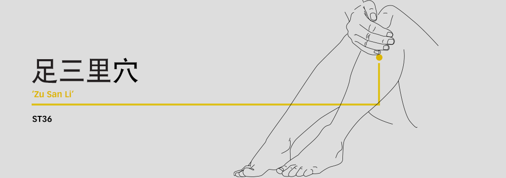 Location: At the lower border of your knee cap, first locate 2 “dimples” at either side of the middle thick tendon. From the outer dimple, place 4 fingers (index to pinky finger) down onto the shin bone. The acupoint is where the edge of your pinky falls.