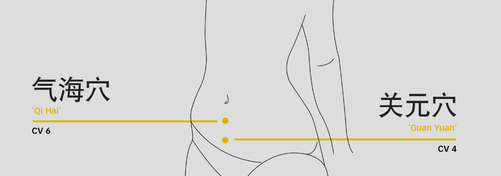 - 气海穴 (Qi Hai, CV 6) can be found midpoint between the navel and 关元穴 (Guan Yuan, CV 4).