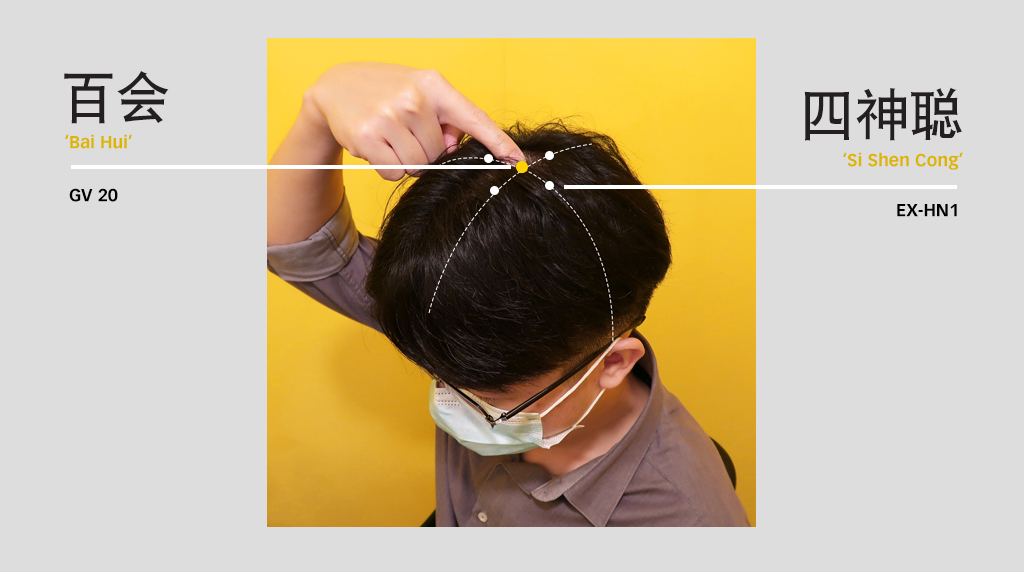 Location: after locating 百会 (Bai Hui, GV 20), 四神聪 (Si Shen Cong, EX-HN1) can be found left, right, up and down of 百会, one thumb-width spacing apart.