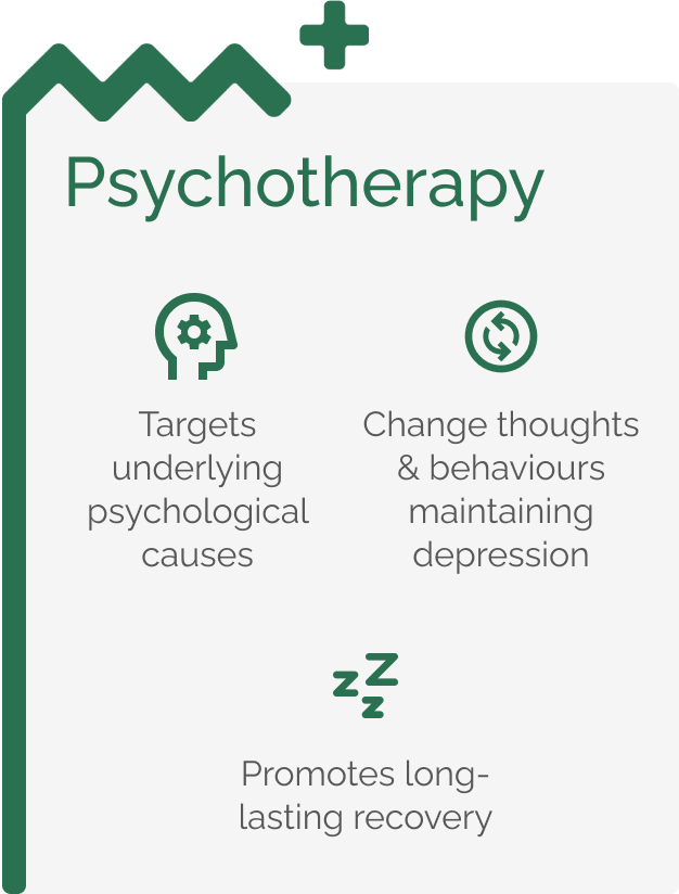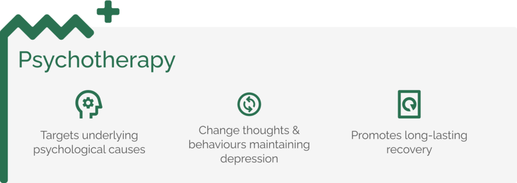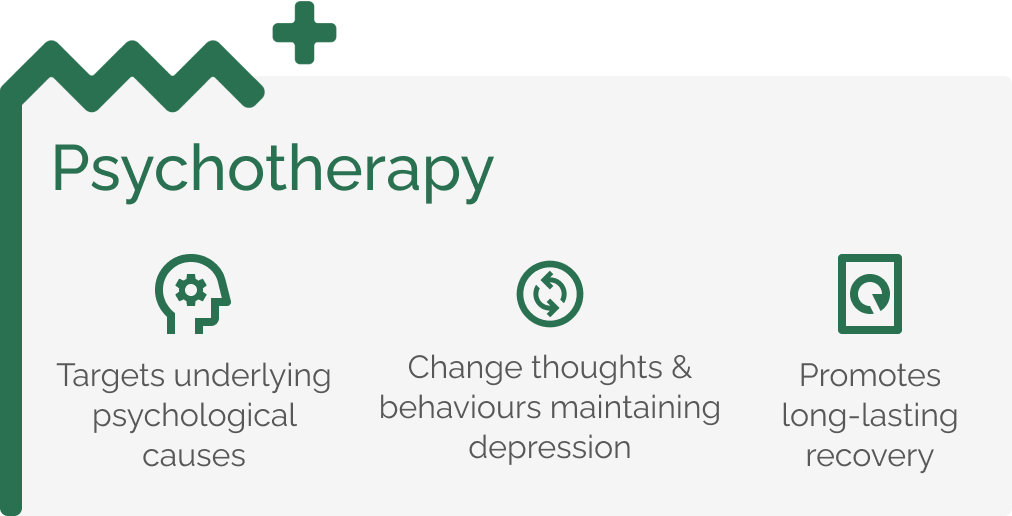 Psychotherapy using approaches such as Cognitive-behavioural therapy (CBT) and Behavioural Activation is a medical ‘gold standard’ treatment for depression backed by strong research evidence of effectiveness.