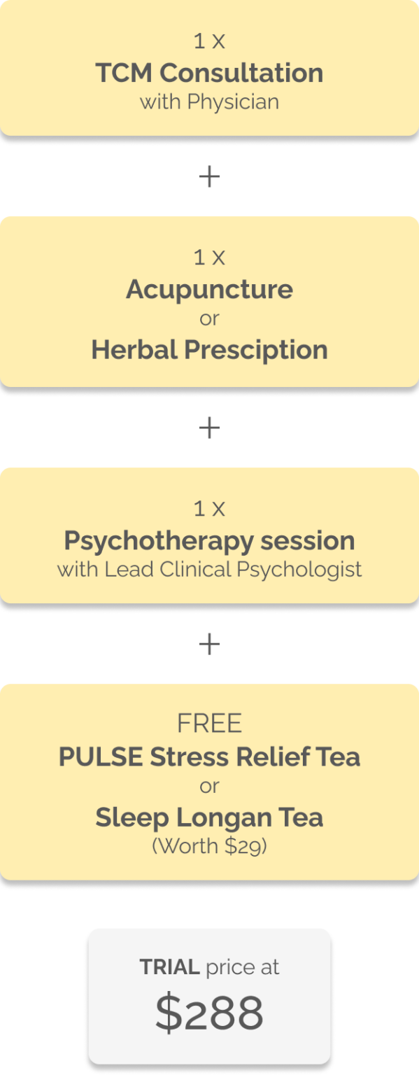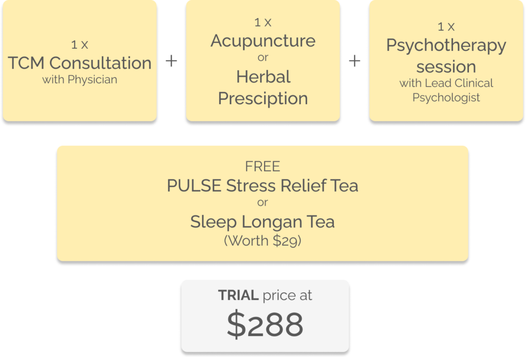 PULSE offers a natural, alternative approach for managing depression. We provide Traditional Chinese Medicine (TCM) treatments targeted towards improving depression symptoms. In our East-meets-West program, you also have the option to combine evidence-based therapy by a clinical psychologist for a more holistic recovery.