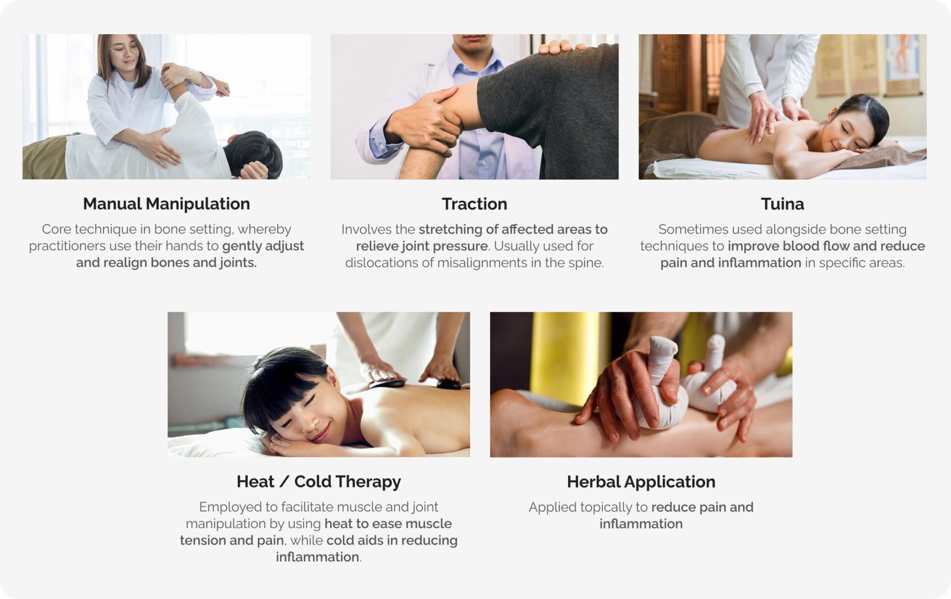 Bone setting is a traditional Chinese medicine (TCM) treatment that is completely carried out by hand to address joint and muscle conditions.