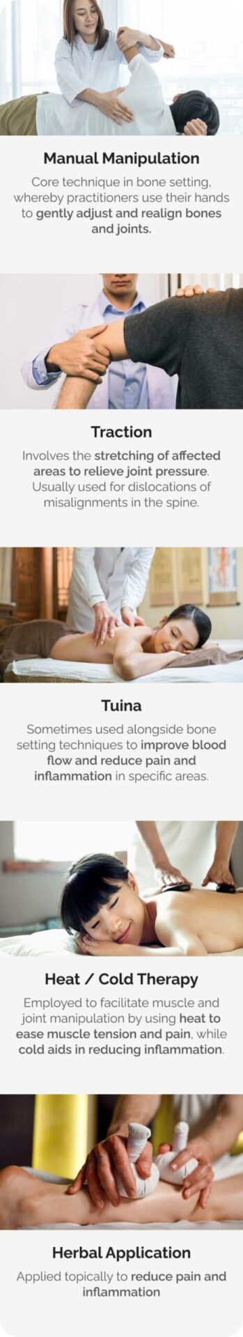 Tuina: Sometimes used alongside bone setting techniques to improve blood flow and reduce pain and inflammation in specific areas.